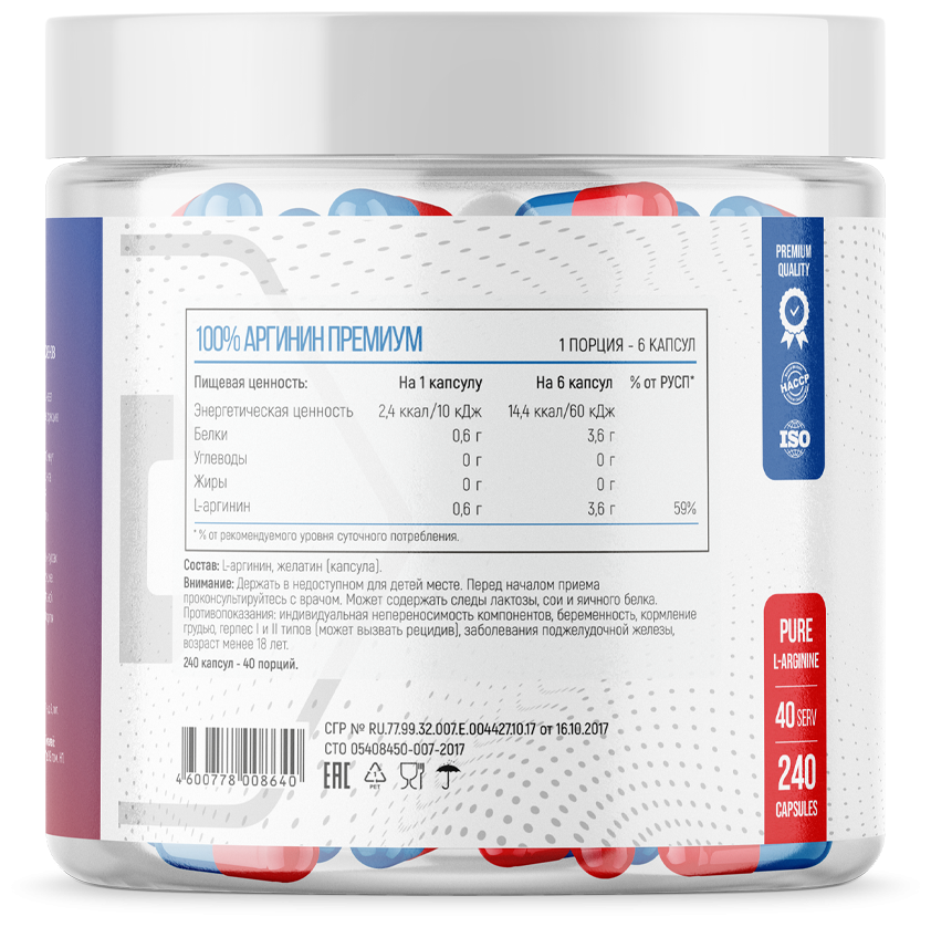 Для производства 100% L-Arginine premium используется высококачественное сырье, а также инновационные методы его обработки. Все это сочетается в формуле лишенной сахара, красителей и других сторонних смесей. Вы получаете 100% L-Аргинин в быстрорастворимой форме. Более того, добавку не нужно готовить, ведь она имеет удобную форму капсул, благодаря чему еще быстрее усваивается. Спустя всего 15 минут вы ощущаете мощный прилив сил и пампинг. Что не менее важно, добавка полностью натуральна, не имеет побочных эффектов и может использоваться на постоянной основе.