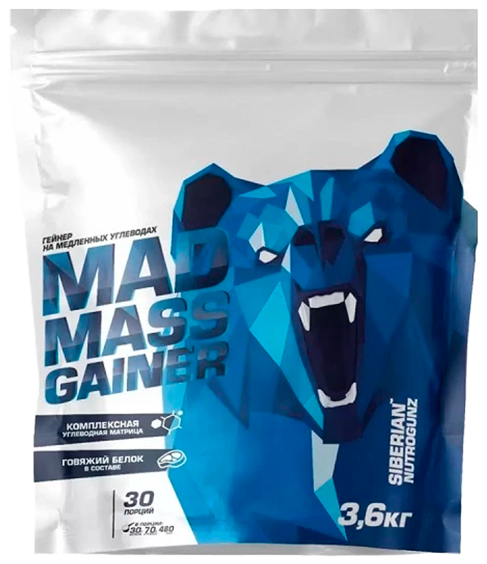 Гейнер на медленных углеводах. В Отличие от распространенных формул, Mad Mass Gainer содержит комплексную углеводную матрицу. Основа продукта - цельнозерновая рожь (38%), дополненная говяжьим белком (25%), что обеспечивает полноценное питание организма. Входящая в состав клетчатка помогает в работе пищеварительной системе.