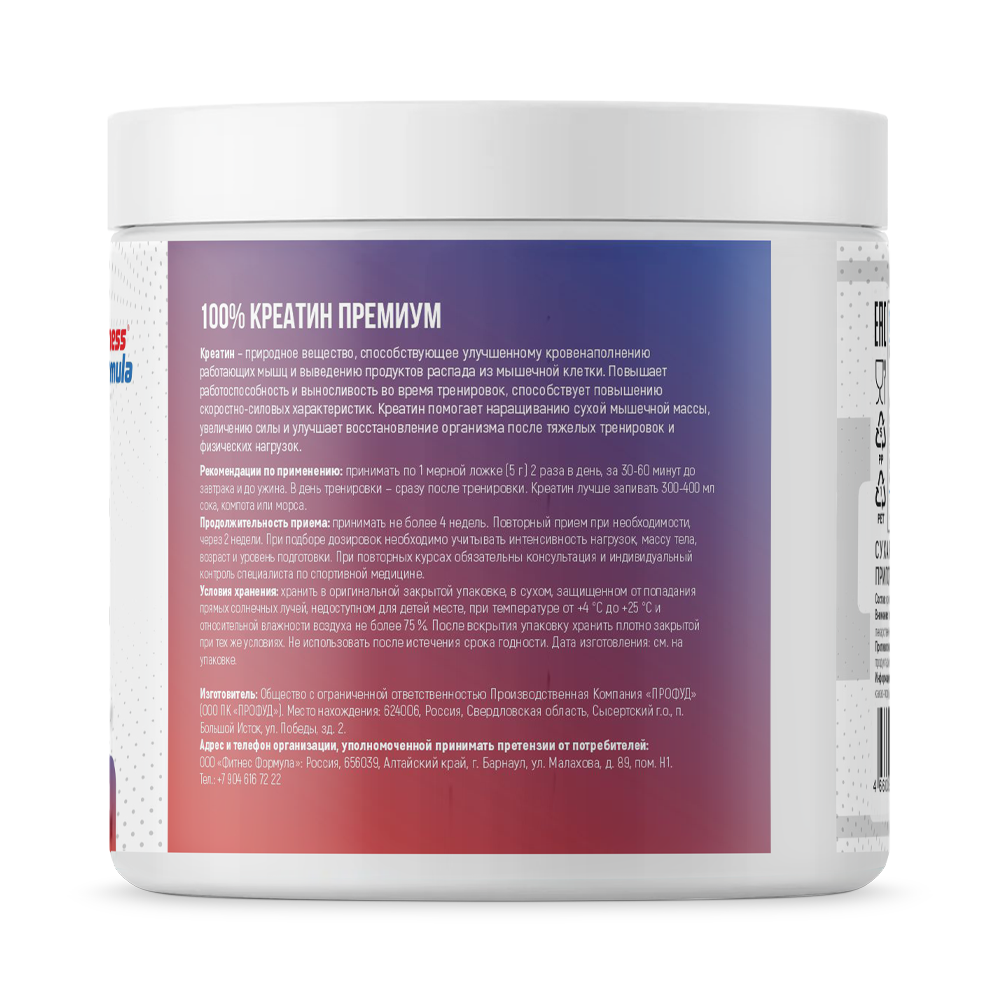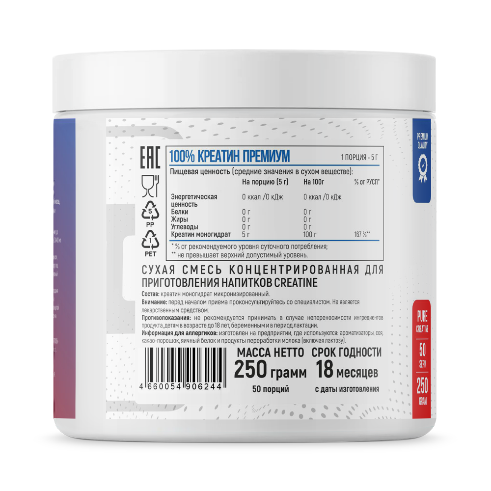 Креатин - природное вещество, способствующее улучшенному кровенаполнению работающих мышц и выведению продуктов распада из мышочной клетки, Повышает работоспособность и выносливость во время тренировок, способствует повышению скоростно-силовых характеристик. Креатин помогает наращиванию сухой мышечной массы, увеличению силы и улучшает восстановление организма после тяжелых тренировок и физических нагрузок.