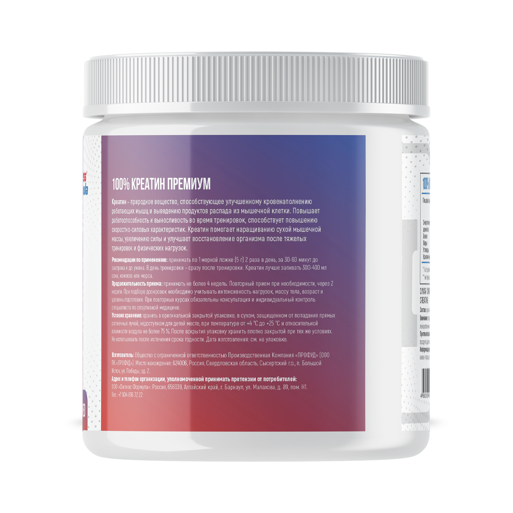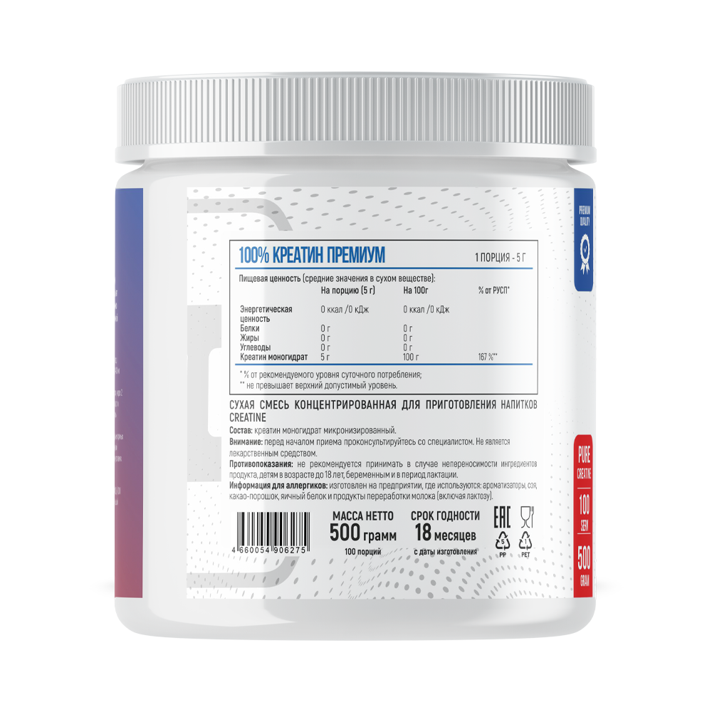 Креатин - природное вещество, способствующее улучшенному кровенаполнению работающих мышц и выведению продуктов распада из мышочной клетки, Повышает работоспособность и выносливость во время тренировок, способствует повышению скоростно-силовых характеристик. Креатин помогает наращиванию сухой мышечной массы, увеличению силы и улучшает восстановление организма после тяжелых тренировок и физических нагрузок.