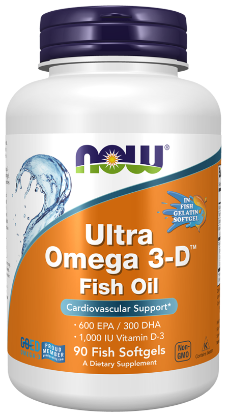 Ultra Omega 3-D от NOW - это наше самое мощное средство с омега-3, содержащее 600 мг ЭПК и 300 мг ДГК в каждой капсуле. Продукт содержит лимонное масло, а также 1000 МЕ витамина D3. Этот концентрат рыбьего жира производится в соответствии со строгими стандартами контроля качества. Он протестирован на отсутствие потенциально опасных загрязняющих веществ (например, ПХД, ртути, диоксинов и других загрязняющих веществ). В этом продукте используется капсула из рыбьего желатина, которая является альтернативой капсуле из говяжьего и свиного желатина.